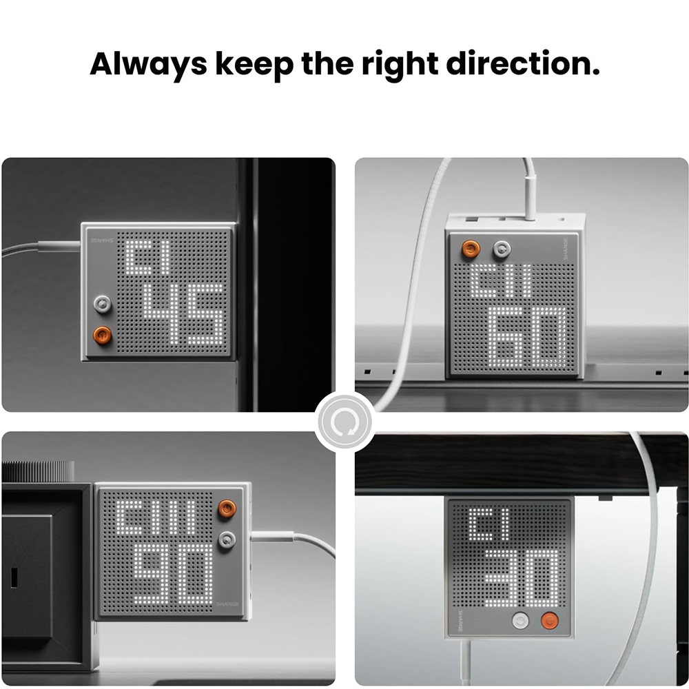 - Iconic Smart Dot Matrix Display: Shows real-time output for each port or total wattage. Allows display orientation adjustments with a simple tap, brightness adjustments, and screen on/off.