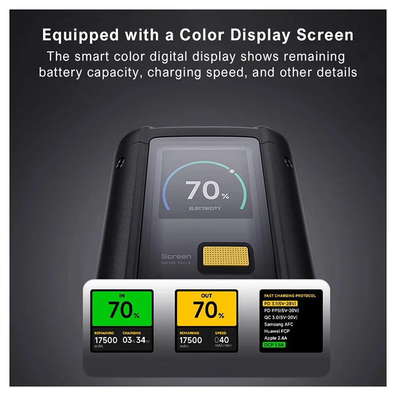 - Color Display Screen: Smart color digital display provides real-time details, including remaining battery capacity, charging speed, and device status, ensuring hassle-free monitoring.